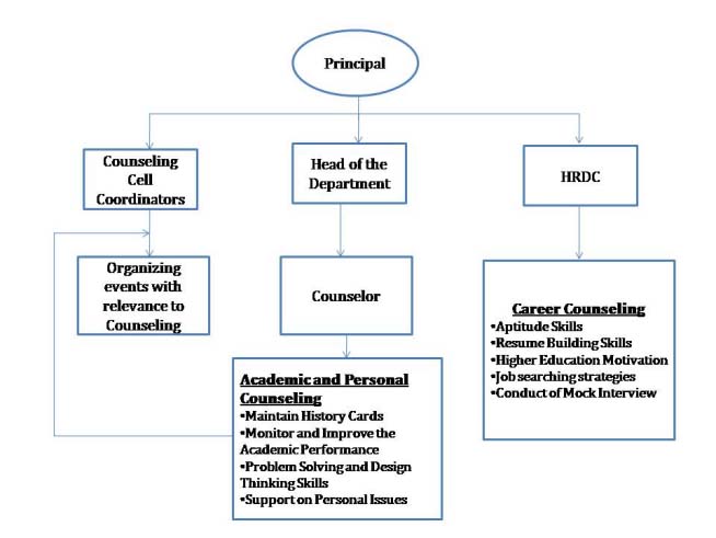 Career counseling helps students identify their values, interests, skills, passions, and outlook, which shape their career choices. The Human Resource Development Cell (HRDC) provides additional support through job search guidance, CV preparation, interview training, and personality development. The cell also organizes regular placement drives for students. Periodic awareness programs are conducted on higher education opportunities, government jobs and entrepreneurship. One-to-one guidance is provided to students who seek personalized support.